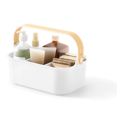 These handy bins make it easy to quickly and conveniently organize any space. Made from recycled plastic and sustainable wood, these stackable bins are built to last. Plus, they're made with integrated handles so they're easy to carry around, no matter how full they get! They're also available in two sizes and even better: you can remove the dividers so you can use them however best fits your organizing needs.