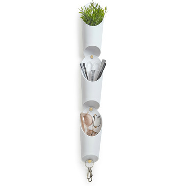 Floralink is a set of three wall vessels that link together and hold indoors plants like succulents. They make an eye-catching statement on your wall thanks to their fresh white color and brass hardware. Combine and link multiple sets together to create a live garden on your wall. These pretty molded vessels have a shape inspired by organ pipes and can be used to hold items aside from plants, making them a compact open storage item, great for small spaces. Easy to mount, these vessels include all hanging hardware and each set of three only requires one hole in the wall to be hung up.