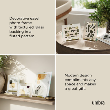 Introducing the Umbra Flute Picture Frame, a stylish addition to your home decor. With its decorative easel design, this frame effortlessly showcases your cherished memories. Its versatile design accommodates both 4x6, 5x7 or 8x10 photos, while the ribbed glass texture adds an elegant touch. Plus, enjoy the freedom to display your photos in either landscape or portrait orientation. Capture and display your favorite moments with flair using the Umbra Flute Picture Frame. Each metal piece is carefully and individually polished by hand, ensuring that every item has its own unique character and shine. Slight variations or inconsistencies in the finish may occur due to the handmade nature of the product.