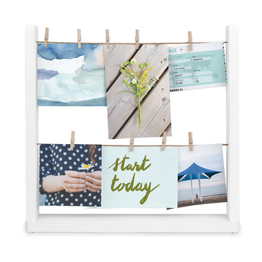 Clothesline-style photo frame from the Hang it Collection by Umbra Two rows of twine - ample space to display photos, cards, memos, artwork or notes Six clothespins