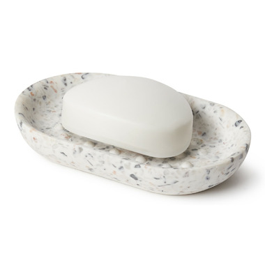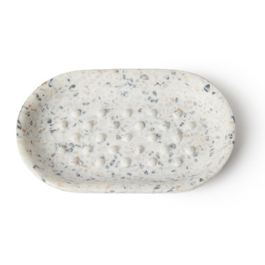 A modern soap dish for the bathroom, part of the Junip Terrazzo Collection. With a one-of-a-kind terrazzo pattern, rounded lines, and natural tones, this oval soap dish will complement any bathroom space.