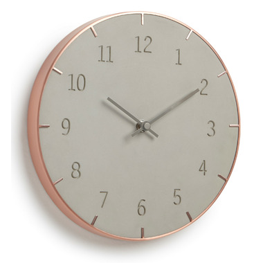 Umbra Piatto Wall Clock is a concrete resin wall clock with engraved numbers framed with a copper metal rim. The combination of concrete and copper reflect the latest trend in mixed materials. Quartz clock movement.