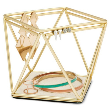 Umbra Prisma Accessory Organizer is perfect for organizing your jewelry. The brass frame allows you to string earrings through its rods and you can place larger jewelry on its lined tray.