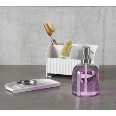 Including a convenient and removable 500 ml soap pump bottle and a water-catching drainage tray, that even provides additional storage, the SLING CADDY features a visually appealing design while optimizing functionality in the kitchen.