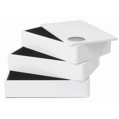 Use Spindle to keep all your favourite jewellery pieces in one place, making them easy to access. Three hidden compartments allow you to store your rings, earrings, bracelets, watches, necklaces and other accessories in different configurations, depending on what works best for you. Each drawer is lined with soft fabric to keep your jewellery from moving around or getting damaged. The simple, modern pivoting design of Spindle is an attractive addition to your dresser, nightstand, desk or wherever you choose to put it. Spindle has a white, high-gloss finish and has a soft fabric lining underneath to prevent your furniture from getting scratched.