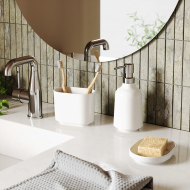 Step has sleek, shiny, and modern, creating a contemporary version of a typical soap pump. The products crisp clean lines make it a modern fixture for your space. Constructed of highly durable material melamine, Step has a low-risk for breakage and is long-lasting. With a capacity of 13 ounces (384 mL) and a wide opening, Step is both easy to refill and holds a large quantity of soap. The dispenser has a beautiful glossy finish and is an ideal addition to any washroom, laundry room, or kitchen. Pair this soap pump with other accessories from the Step Bathroom Collection for a more cohesive look. Step Soap Pump measures 3.75 x 3.75 x 7" (10 x 10 x 18 cm).