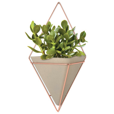 Umbra Trigg Wall Vessel is a wall-mounted concrete resin vessel in a diamond shaped copper wire frame. It can be arranged in a multitude of compositions and can be used anywhere around your home as a planter or for storage of supplies and knickknacks.