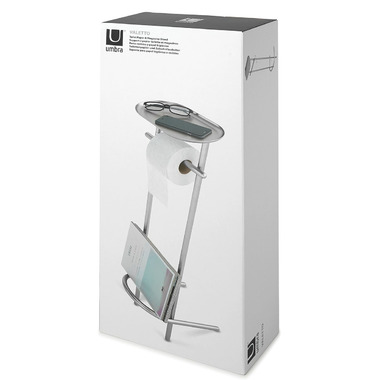Keeping smaller spaces organized can be tricky. This is especially true in bathrooms that often have little or no under cabinet storage. The Umbra Valetto Toilet Paper Stand and Magazine Holder remedies this challenge thanks to its efficient 3-in-1 design featuring a toilet paper dispenser, magazine rack, and tray for small accessories.