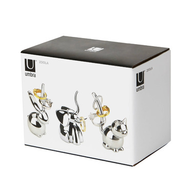 The Umbra Zoola Ring Holder 3 Pack in Chrome features animal shaped ring holders in a beautiful chrome finish. This 3 Pack features a rabbit, cat and, elephant motif. Fun, playful and stylish, these functional ring storage pieces double as decor.