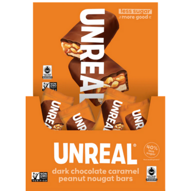 Unreal was started so everyone can enjoy out of this world, all real chocolate snacks without all the sugar. These caramel nouget bars are made with fair trade dark chocolate and has 2g of protein per bar. They're sweetened with no sugar sugar alcohols.