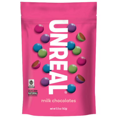 Unreal was started so everyone can enjoy out of this world, all real chocolate snacks without all the sugar. These gems are made with rich, fair trade milk chocolate. They're coloured by veggies, gluten free, and sweetened without sugar alcohols. No artificial anything. For real. And the taste is UNREAL!
