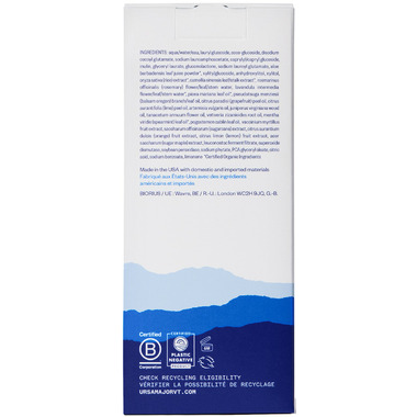 Aqua/water/eau, Lauryl Glucoside, Coco-gluoside, Disodium Cocoyl Glutamate, Sodium Lauroamphoacetate, Caprylyl/capryl Glucoside, Inulin, Glyceryl Laurate, Gluconolactone, Sodium Lauroyl Glutamate, Aloe Barbadensis Leaf Juice Powder*, Xylitylglucoside, Anhydroxylitol, Xylitol, Oryza Sativa (Rice) Extract*, Camellia Sinensis Leaf/stalk/extract*, Rosmarinus Officinalis (Rosemary) Flower/leaf/stem Water, Lavandula Intermedia Flower/leaf/stem Water*, Picea Mariana Leaf Oil*, Pseudotsuga Menziesii (Balsam Oregon) Branch/leaf Oil, Citrus Paradisi (Grapefruit) Peel Oil, Citrus Aurantifolia (Lime) Peel Oil, Artemisia Vulgaris Oil, Juniperus Virginiana Wood Oil, Tanacetum Annuum Flower Oil, Vetiveria Zizanioides Root Oil, Mentha Viridis (Spearmint) Leaf Oil*, Pogostemon Cablin Leaf Oil, Vaccinium Myrtillus Fruit Extract, Saccharum Officinarum (Sugarcane) Extract, Citrus Aurantium Dulcis (Orange) Fruit Extract, Citrus Limon (Lemon) Fruit Extract, Acer Saccharum (Sugar Maple) Extract, Leuconostoc Ferment Filtrate, Superoxide Dismutase, Soybean Peroxidase, Sodium Phytate, Pca Glyceryl Oleate, Citric Acid, Sodium Benzoate, Limonene *certified Organic Ingredients