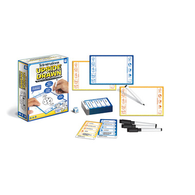 Telestrations: Upside Drawn puts a teamwork spin on The Telephone Game Sketched Out by putting the pen in one persons hand, and control of the board in another's! Only through Up or Down directives can the team put the pen and board together to guess the clue first! The team to reach 20 points wins!