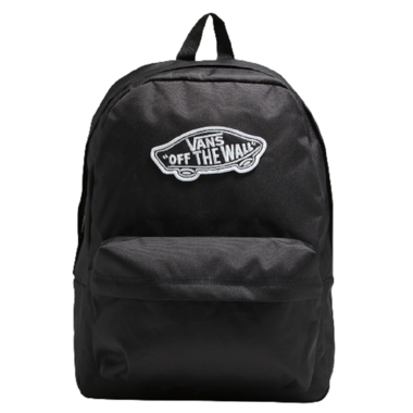 The Realm Backpack is a recycled polyester two-pocket backpack with a zippered main compartment, an interior laptop sleeve, a front organization pocket, adjustable padded straps, and debossed lining at the interior back panel.