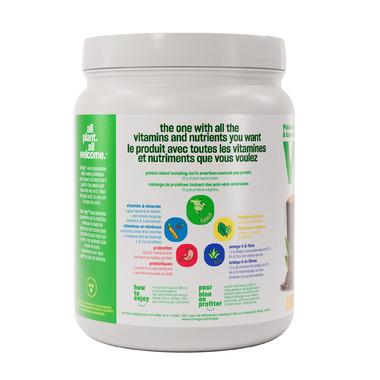 One and done. Each scoop is packed with more tasty benefits than you can shake a shaker cup at: 20g of plant protein, plus vitamins, minerals, probiotics, fibre, omega-3 polyunsaturates, and good-for-you greens.