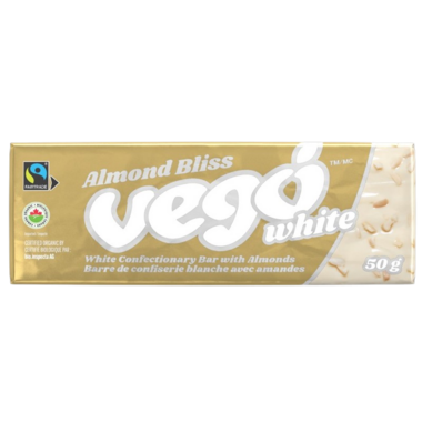 Vego Almond Bliss White Confectionery Bar is an organic and fair trade almond candy.