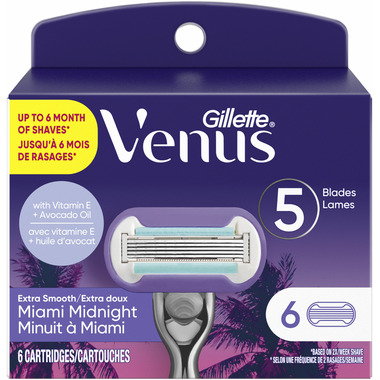 Get vacation worthy skin in just one stroke. The Gillette Venus Miami Midnight Extra Smooth razor refills feature 5 diamond-like coated blades for an extra smooth shave that lasts, and a lubrastrip with vitamin E & avocado oil for smooth glide. The Venus Miami Midnight refills feature a SkinElixir Lubrastrip that delivers a long-lasting shave with 10x more lubricants*, and a ribbon of moisture that activates when wet, releasing a protective glide that helps protect your skin from nicks, cuts, and shaving irritation**. These razor refills also come with a pivoting rounded razor head that adapts to your body’s contours, giving you a comfortable shave even when shaving tricky or hard-to-reach areas like knees and ankles. Each Venus blade refill lasts for up to one month of shaving based on 2x/week shave. Concerned your Gillette Venus Miami Midnight razor refill won't fit your Venus razor handle? All Gillette Venus women's razor refills are compatible with any Venus razor handle, except for Simply Venus, Venus for Pubic Hair and Skin, and Venus Radiant Skin. (*vs. lubricants by weight vs Venus Smooth (**US Consumer Study, Feb 2018.