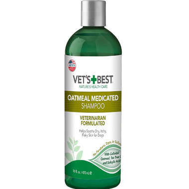 Calm and moisturize itchy, dry, flaky skin with Vet's Best Oatmeal Medicated Dog Shampoo. The veterinarian-formulated shampoo is a soothing mix of salicylic acid and key natural ingredients (including colloidal oatmeal, tea tree oil, and vitamin B5) that eliminates dandruff and flaking; clears and tightens pores; and cleans and stimulates your dogs skin for a healthy glow. Will not affect topical flea and tick control products.