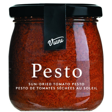 Made with dried tomatoes, Genoese basil D.O.P., Grana Padano, cashew nuts and extra virgin olive oil. This fruity pesto is crafted according to Vianis classic recipe without garlic. It can be used as a pesto with hot pasta as well as on bruschetta.