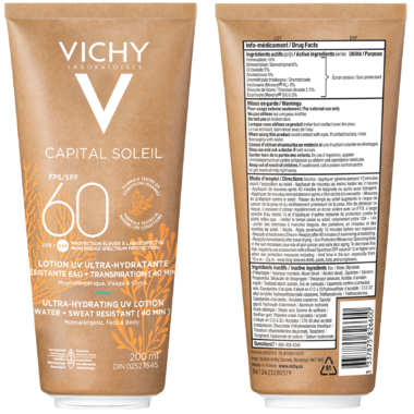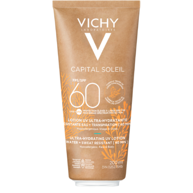 NEW Capital Soleil ULTRA-HYDRATING UV LOTION SPF 60 lotion for face and body provides advanced high broad-spectrum protection against harmful UVA and UVB rays. Enriched with Hyaluronic Acid, the lotion allows for long-lasting 24H hydration and spreads evenly for an invisible, non-greasy finish with a 40-minute water and sweat resistance. 95% of consumers said that Capital Soleil ULTRA-HYDRATING UV LOTION SPF 60 melts on the skin, that the skin feels moisturized and that it does not leave white marks.*