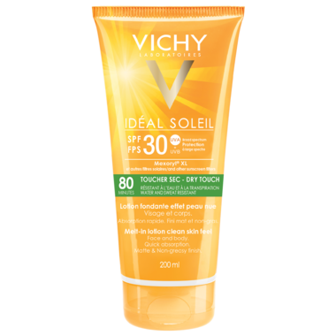 Vichy Ideal Soleil Dry Touch SPF30 Lotion Face & Body Sunscreen is quickly absorbed leaving the skin matte and with a non-greasy finish. Express dry-touch, moisturizing formula, ideal for face and daily use. 80 minutes water and sweat resistant. Non-shiny. Non-sticky. No white caste. Tested on sensitive skin. Hypoallergenic. Fragrance-free. Paraben-free. Non-comedogenic. Tested under dermatological control.