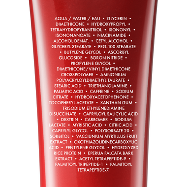 Aqua / Water / Eau, Glycerin, Dimethicone, Hydroxypropyl Tetrahydropyrantriol, Isononyl Isononanoate, Niacinamide, Alcohol Denat., Cetyl Alcohol, Glyceryl Stearate, Peg-100 Stearate, Butylene Glycol, Ascorbyl Glucoside, Boron Nitride, Propylene Glycol, Dimethicone/vinyl Dimethicone Crosspolymer, Ammonium Polyacryloyldimethyl Taurate, Stearic Acid, Triethanolamine, Palmitic Acid, Caffeine, Sodium Citrate, Hydroxyacetophenone, Tocopheryl Acetate, Xanthan Gum, Trisodium Ethylenediamine Disuccinate, Capryloyl Salicylic Acid, Dextrin, Carbomer, Sodium Lactate, Myristic Acid, Citric Acid, Caprylyl Glycol, Polysorbate 20, Sorbitol, Vaccinium Myrtillus Fruit Extract, Oxothiazolidinecarboxylic Acid, Pentylene Glycol, Hydrolyzed Rice Protein, Eperua Falcata Bark Extract, Acetyl Tetrapeptide-9, Palmitoyl Tripeptide-1, Palmitoyl Tetrapeptide-7