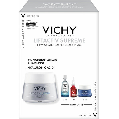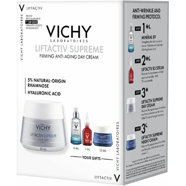 Includes: Full size Liftactive Supreme Day Cream (50ml), but also receive the following gifts: (1) Minéral 89 (3ml), (2) Liftactiv Supreme Night (15ml) & (3) B3 Corrector Serum (1ml).