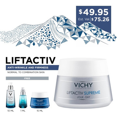Reduce the appearance of wrinkles and fine lines with this anti-aging set. Not only get a full size Liftactiv Supreme Day Care (50ml), but also receive the following free gifts: Mineral 89 (10ml), Mineral 89 Eyes (1ml) and Liftactiv Supreme Night Care (15ml). Liftactiv Supreme Day Care combines powerful Rhamnose, Neohesperidine, Caffeine and Adenosine to create long-lasting anti-aging results on the skin.