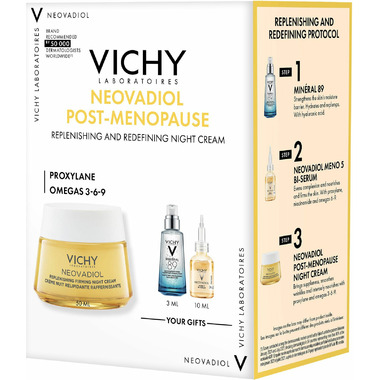 Includes: Full sizeVichy Neovadiol Peri Menopause Night Cream (50ml), as well as the following gifts: (1) Neovadiol Bi Serum (2x 5ml) & (2) Minéral 89 (3ml).
