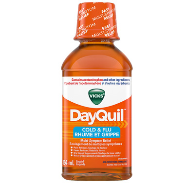 DayQuil Cold & Flu delivers non-drowsy cold & flu multi-symptom relief that help you get through your day. Temporarily relieves common cold/flu symptoms: nasal congestion, cough due cold, sore throat, headache, minor aches and pains and fever.