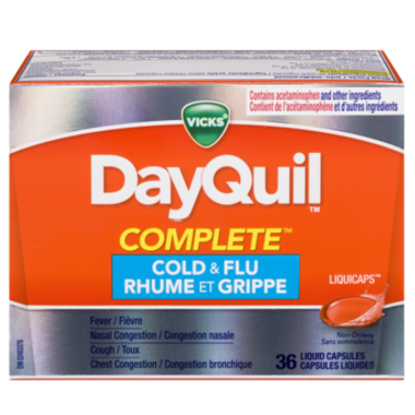 - NON-DROWSY DAYTIME COLD & FLU SYMPTOM RELIEF. DayQuil COMPELETE temporarily relieves common cold & flu symptoms so you can get on with your day
