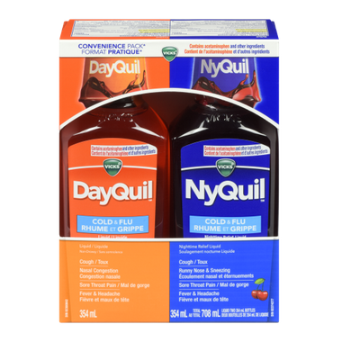 Warning: DayQuil: Liver warning: Acetaminophen may cause severe or possibly fatal liver damage if you take: more than the recommended dose in 24 hours, with other drugs containing acetaminophen, while drinking 3 or more alcoholic drinks every day. Symptoms of liver damage may include: yellow skin or eyes, dark urine, sweating, nausea, vomiting, stomach pain, unusual tiredness, loss of appetite. Allergy alert: Acetaminophen may cause serious skin reactions. Symptoms may include: skin reddening, blisters, rash. If any of the above noted symptoms occur, stop use and seek medical help right away. Do not use: with other drugs containing acetaminophen or dextromethorphan, if you are allergic to acetaminophen. If you are not sure whether a drug contains acetaminophen, ask a doctor or pharmacist, with a monoamine oxidase inhibitor (MAOI) (drugs for depression or Parkinsons disease) or for 2 weeks after stopping the MAOI drug. Ask a doctor or pharmacist before use if you have: liver, kidney, heart or thyroid disease, high blood pressure, diabetes, asthma, glaucoma, chronic lung disease or shortness of breath, a cough with excessive phlegm (mucus), persistent or chronic cough such as occurs with smoking, asthma or emphysema. These could be signs of a serious condition, difficulty urinating due to an enlarged prostate gland, take the blood thinning drug warfarin, are pregnant or breastfeeding. Stop use and ask a doctor if: symptoms last for more than 5 days, worsen or you get fever (>38ҰC), fever lasts for more than 3 days, cough worsens or persists more than 1 week, sore throat pain is severe, persists more than 2 days, is accompanied or followed by fever, persistent headache, rash, nausea, or vomiting, you get nervous, dizzy or sleepless. Keep out of reach of children. This package contains enough medicine to seriously harm a child. In case of overdose, get medical help or contact a Poison Control Centre right away. Quick medical attention is critical even if you do not notice any signs or symptoms. NyQuil: Liver warning: Acetaminophen may cause severe or possibly fatal liver damage if you take: more than the recommended dose in 24 hours, with other drugs containing acetaminophen, while drinking 3 or more alcoholic drinks every day. Symptoms of liver damage may include: yellow skin or eyes, dark urine, sweating, nausea, vomiting, stomach pain, unusual tiredness, loss of appetite. Allergy alert: Acetaminophen may cause serious skin reactions. Symptoms may include: skin reddening, blisters, rash. If any of the above noted symptoms occur, stop use and seek medical help right away. Do not use: with other drugs containing acetaminophen, doxylamine succinate or dextromethorphan, if you are allergic to acetaminophen. If you are not sure whether a drug contains acetaminophen, ask a doctor or pharmacist, with a monoamine oxidase inhibitor (MAOI) (drugs for depression or Parkinsons disease) or for 2 weeks after stopping the MAOI drug. Ask a doctor or pharmacist before use if you have: liver or kidney disease, asthma, glaucoma, chronic lung disease or shortness of breath, a cough with excessive phlegm (mucus), persistent or chronic cough such as occurs with smoking, asthma or emphysema. These could be signs of a serious condition, difficulty urinating due to an enlarged prostate gland, take the blood thinning drug warfarin, take sedatives or tranquilizers, are pregnant or breastfeeding, are elderly. When using this product: drowsiness may occur, alcohol, sedatives and tranquilizers may increase drowsiness, do not drive or engage in activities requiring alertness, avoid alcoholic drinks, excitability may occur, especially in children. Stop use and ask a doctor if: symptoms last for more than 5 days, worsen or you get fever (>38ҰC), fever lasts for more than 3 days, symptoms are accompanied by the production of thick yellow/green phlegm, sore throat pain lasts more than 2 days, rash or persistent headache develops. Keep out of reach of children. This package contains enough medicine to seriously harm a child. In case of overdose, get medical help or contact a Poison Control Centre right away. Quick medical attention is critical even if you do not notice any signs or symptoms.