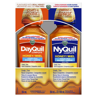 When a cold comes on strong, knock it out with Vicks DayQuil and NyQuil SEVERE Honey Flavor Cold & Flu Liquid medicine. Just one dose starts working fast to relieve 9 of your worst cold and flu symptoms. With this DayQuil and NyQuil SEVERE Combo pack, you'll have the cold and flu multi-symptom relief you need on hand, day and night. Flavored with real honey, Vicks DayQuil & NyQuil SEVERE Honey formulas provide fast, powerful, maximum strength relief for your worst cold and flu symptoms. Helps treat bothersome symptoms like headache, fever, nasal congestion, stuffy nose, sore throat & cough.