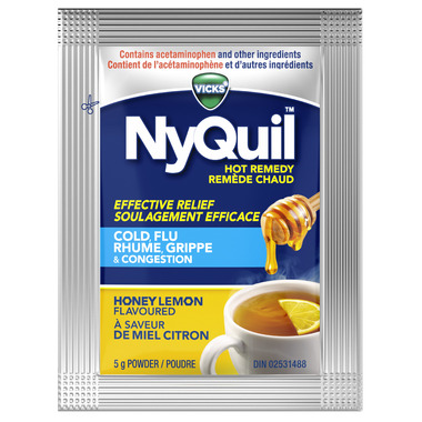 - Vicks NyQuil Hot Remedy Cold, Flu & Congestion provides effective, nighttime relief for your worst cold and flu symptoms. NyQuil Hot Remedy + Congestion relieves headache, fever, sore throat pain, minor aches & pains, sneezing, runny nose, nasal congestion, sinus congestion, sinus pressure and cough. Contains acetaminophen. To ensure this product is right for you, always read and follow the label. Use as directed. Keep out of reach of children.