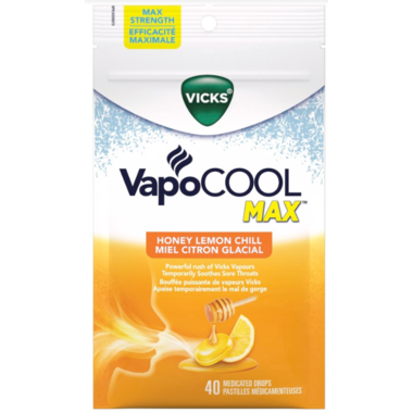 Vicks VapoCOOL MAX Honey Lemon Chill Medicated Cough Drops contain effective medicine that delivers cough and sore throat relief great honey lemon taste, and a rush of Vicks Vapours.