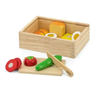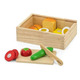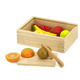 This set includes a melon, an orange, a kiwi, a banana, a pear, a lemon and an apple to cut with the knife and the wooden board.