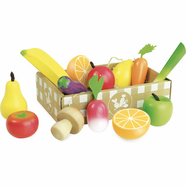 Lovely cardboard crate containing a carrot, a lemon, a radish, a leek, a aubergine, a mushroom, a tomato, a banana, a apple, a pear, a strawberry and two halves of an orange. This set of wooden play fruit and veg is ideal to play shopkeeper.