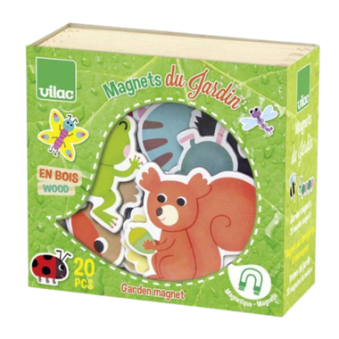 Wooden garden magnets by VILAC features the bright artwork of Melusine Allirol. Includes 20 wooden magnets of varying sizes. Presented in lovely wooden storage box with plexiglass lid for easy clean up. Wooden box measures 15 x 14 x 6 cm. Safety rated for ages 2+.