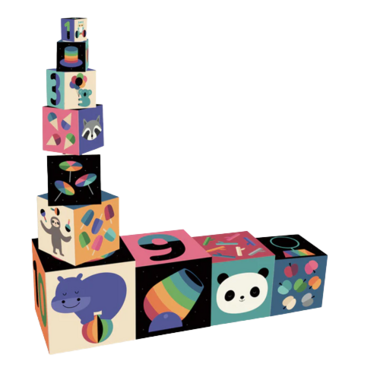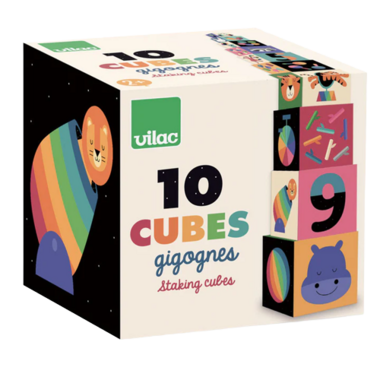 Vilac cardboard nesting blocks are highly educational toys and allow children to discover and acquire a large number of concepts alone or accompanied by an adult. These blocks have been designed to ensure that young children develop while having fun and making discoveries independently. Hollow on the bottom and full on the top, these attractive and trendy blocks, with their colours, can be piled up or fitted into each other, thus allowing a natural approach to the notions of size, the top, the bottom, hidden, inside, next to. And what a joy when the building tumbles down! The portraits of the 10 animals, each as beautiful as the next, will help the little ones to enrich their vocabulary thanks to the hippopotamus, the tiger, the panda, etc. They will also be able to arrange them by size next to each other or inside each other and thus learn about sizes without realizing it: The rabbit is smaller than the panda but the tiger is bigger than the koala! To exercise their skills, children can stack each block from the largest to the smallest, discovering on each side the animals in their circus act and their rainbow accessory (maracas, hats, balloons, umbrellas, etc.) separately on another side. For older children, learning to count will be a pleasure by associating the cake with the number 1, the two carrots with the number 2 and so on. By making discoveries independently, this early learning toy is in line with Montessori teaching methods. Rainbow cardboard nesting blocks illustrated by Andy Westface. Produced by VILAC. Includes 10 nesting blocks with largest block measuring approx: 15 x 15 x 15 cm. Safety rated for ages 2+.