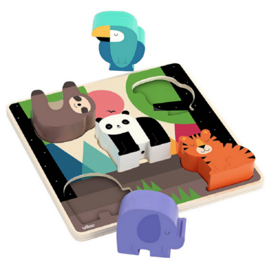 Vilac has designed this magnificent rainbow-coloured touch panel populated with jungle animals, poetically illustrated by the artist Andy Westface. Each animal hides a sound that children from 18 months discover by shaking the pieces. Jingle, clink, whoosh! A bell, a marble, sand, and so on. Each sound is different. Each animal has a specific place. The little ones develop their analytical and observational skills as well as their fine motor skills to place each animal in the right place.