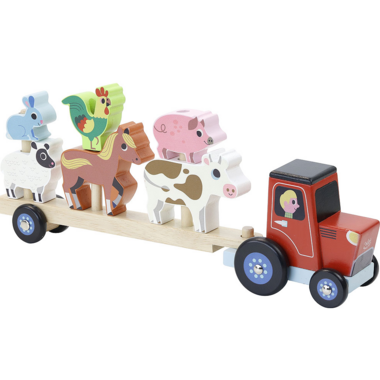 Discover this wooden early learning game drawn with mischief by Ingela P.Arrhenius. Your child will fall in love with the farm animal figurines, the red tractor, and the many possible combinations on the large trailer. Let's go for a walk on the farm. Includes tractor, removable trailer and 6 animals.