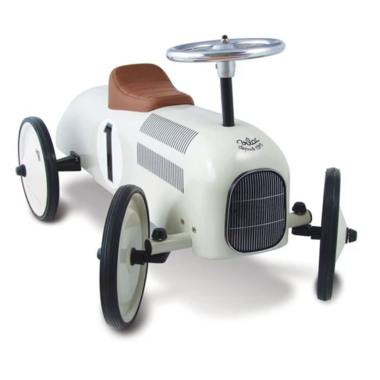 A beautiful addition to your baby's nursery! As your child grows, they will love this beautiful ride-on toy, which is designed in the shape of a vintage racecar. Its made by the storied French company Vilac, which has been making heirloom childrenҒs toys with an old-world attention to detail since 1911. This car has a sturdy, painted steel body and chrome grill, along with moveable front wheels that make steering easy. Guaranteed to inspire hours of fun.
