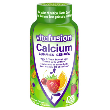 Vitafusion Calcium Gummy Vitamins for Adults make nutrition taste good. They are an excellent source of both Calcium and Vitamin D3, which aids in the absorption of calcium in the body. Together, they are designed to support bone and teeth health, and help to prevent osteoporosis. Getting your daily recommended Calcium through diet alone can be challenging. These gummies contain as much Calcium as two 175-milliliter glasses of milk in each serving, making them a nutritious and delicious solution for adults of any age. Plus, they contain no high fructose corn syrup, synthetic dyes or gluten. Vitafusion Gummies are easy to chew and can be taken without water for added convenience. The delicious, naturally sourced orange, black cherry and strawberry flavours make remembering to take your vitamins easy!