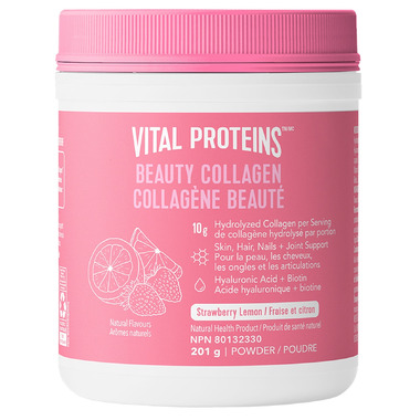 Upgrade your beauty and wellness routine with Vital Proteins Strawberry Lemon Beauty collagen. Delicious, made with no artificial sweetener, and subtly flavoured, this beauty beverage contains a blend of hydrolyzed collagen, hyaluronic acid, biotin, and vitamin C which all help maintain healthy skin, hair, and nails. It also helps our bodies form collagen, which supports the structure and elasticity of our connective tissues, tendons, ligaments, and bones.