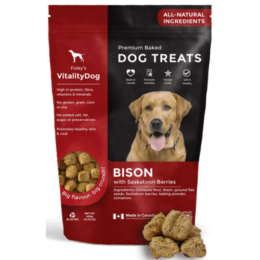 Vitality has created a grain free gourmet treat for your dog. Super lean hormone and antibiotic free range bison with true strong and free unique Canadian Saskatoon berries. Packed with antioxidants and bursting with flavour this is a must have.