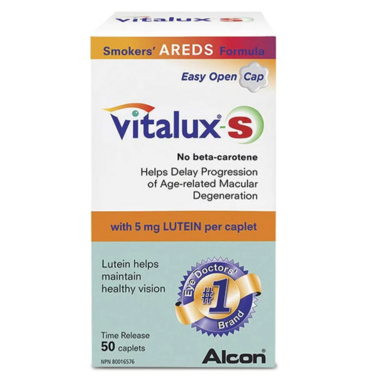 Vitalux-S caplets are an eye vitamin/mineral supplement that helps delay the progression of Age-related Macular Degeneration (AMD) and helps maintain healthy vision. Vitalux-S caplets contain Lutein and Zeaxanthin, helping to increase serum levels within the body. Lutein also will help increase macular pigment optical densities, which reduces the progression of AMD and helps maintain healthy vision. No beta-carotene. Contains no gluten, lactose or artificial flavours.