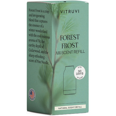 The Vitruvi Forest Frost Air Scent Refill is a crisp and invigorating blend that captures the essence of a winter wonderland with the cool resinous aroma of Fir, the earthy depth of Cedarwood, and the sharp refreshing scent of Pine Needle.
