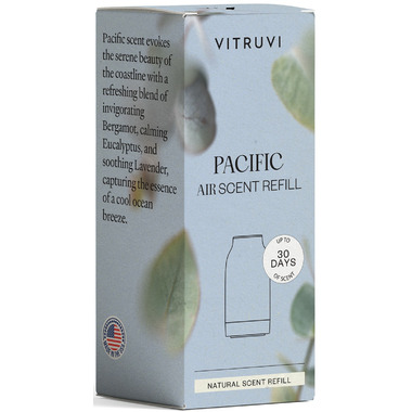 The Vitruvi Pacific Air Scent Refill evokes the serene beauty of the coastline with a refreshing blend of invigorating Bergamot, calming Eucalyptus, and soothing Lavender, capturing the essence of a cool ocean breeze.