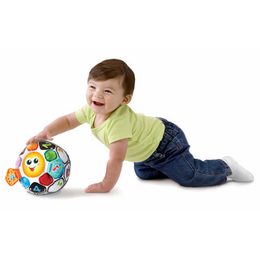 Left or right, up or down, roll the Bright Lights Soccer Ball™ all around to hear music and sounds and listen to the friendly ball encourage playtime. Press the happy light-up face button to hear playful phrases and three songs that introduce opposites and numbers. Kick, pass or shake the ball to activate the motion sensor and hear fun sounds and music, or touch the soft crinkly hands and give the ball a hug. The ball is hand washable and ready for fun. Kick up some fun with this lovable and huggable soft soccer ball!