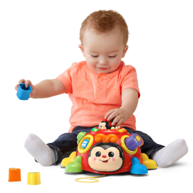 Wobbly surprises await with the Crazy Legs Learning Bugs™ interactive pull toy! Children can sort and pop shapes as they sit on the floor and use the storable cord to pull it when they start to toddle. This adorable bug has four easy-grasp, colorful shape blocks for sorting. Place them in the matching slots on mommy ladybug's back to learn about shapes, colors, numbers and nature objects. Press down on the baby ladybug on mommy bug’s back to pop blocks out after they're sorted! Meet two buggy friends and hear playful music and sounds when you press the light-up buttons on the bug’s back. Little nature lovers get a leg up on learning! With 35+ sounds and phrases, children hear about nature, shapes and colors in Learning mode. In Music mode, listen to 25+ songs and melodies such as Flight of the Bumble Bee and Old MacDonald.